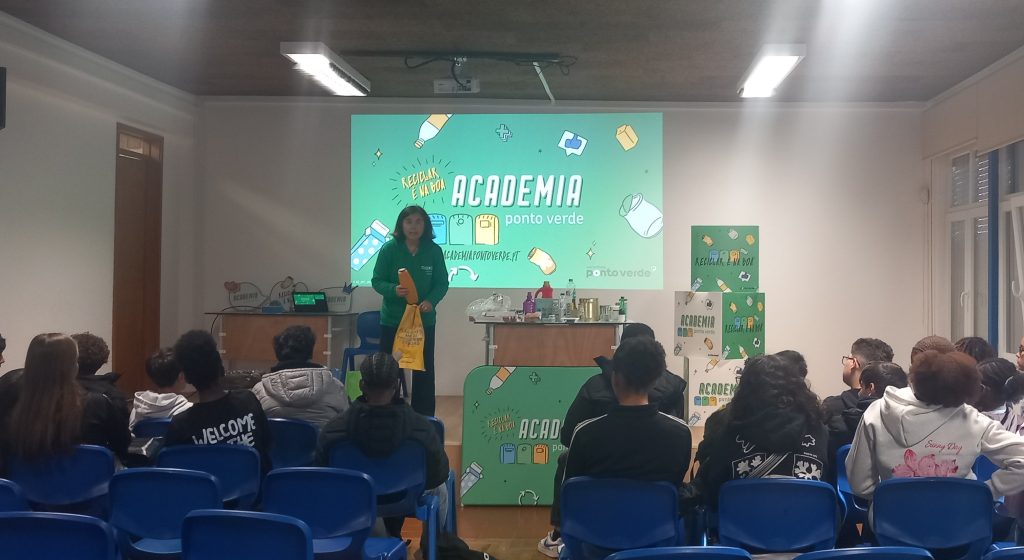 No âmbito do programa Eco-Escolas, no dia 04/12, a turma do 8.º 5.ª, duas alunos do 9.º 2 e alunos da Unidade de Ensino Estruturado, assistiram ao Roadshow “Reciclar é na boa!”, da Sociedade Ponto Verde. Algumas das temáticas abordadas foram: